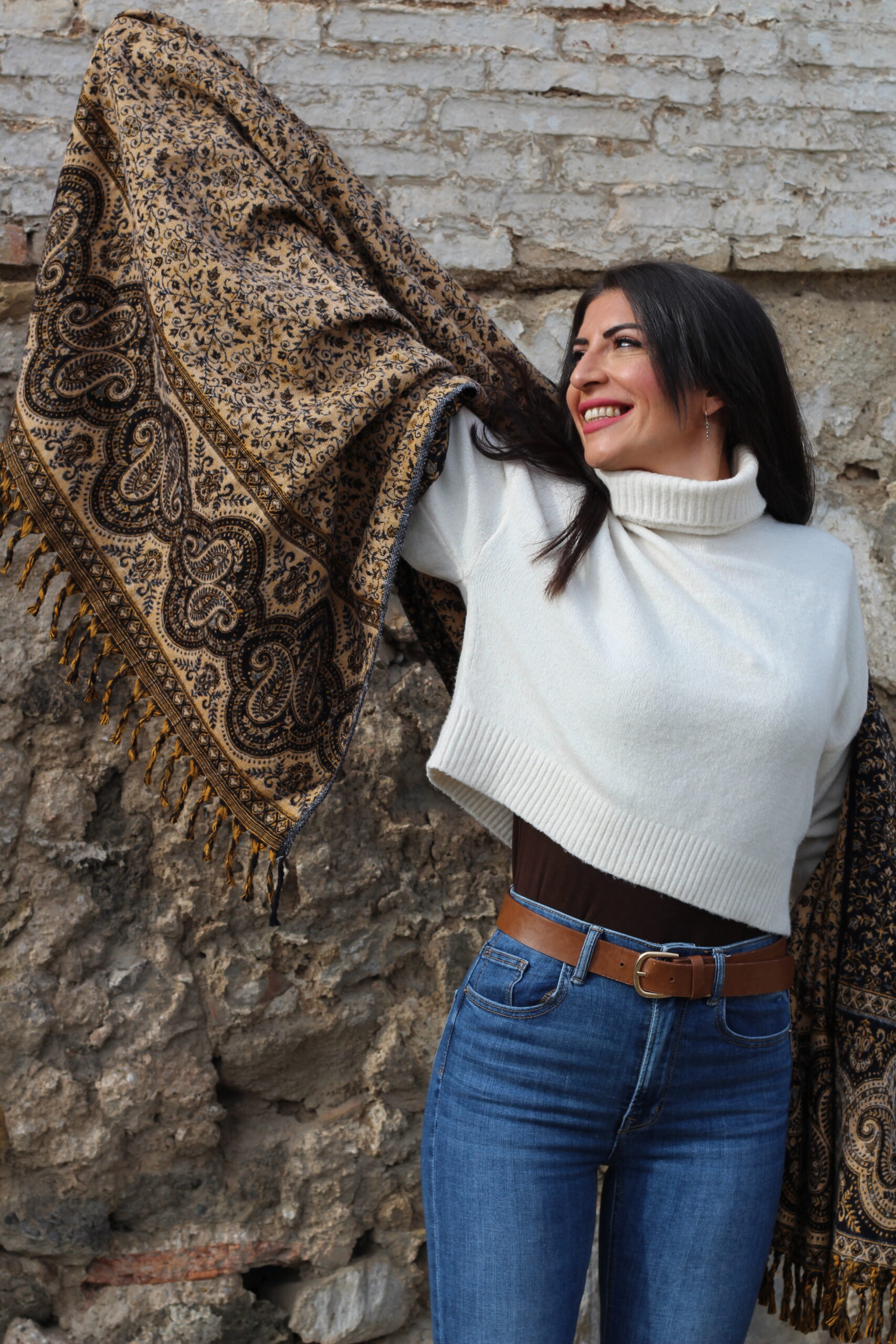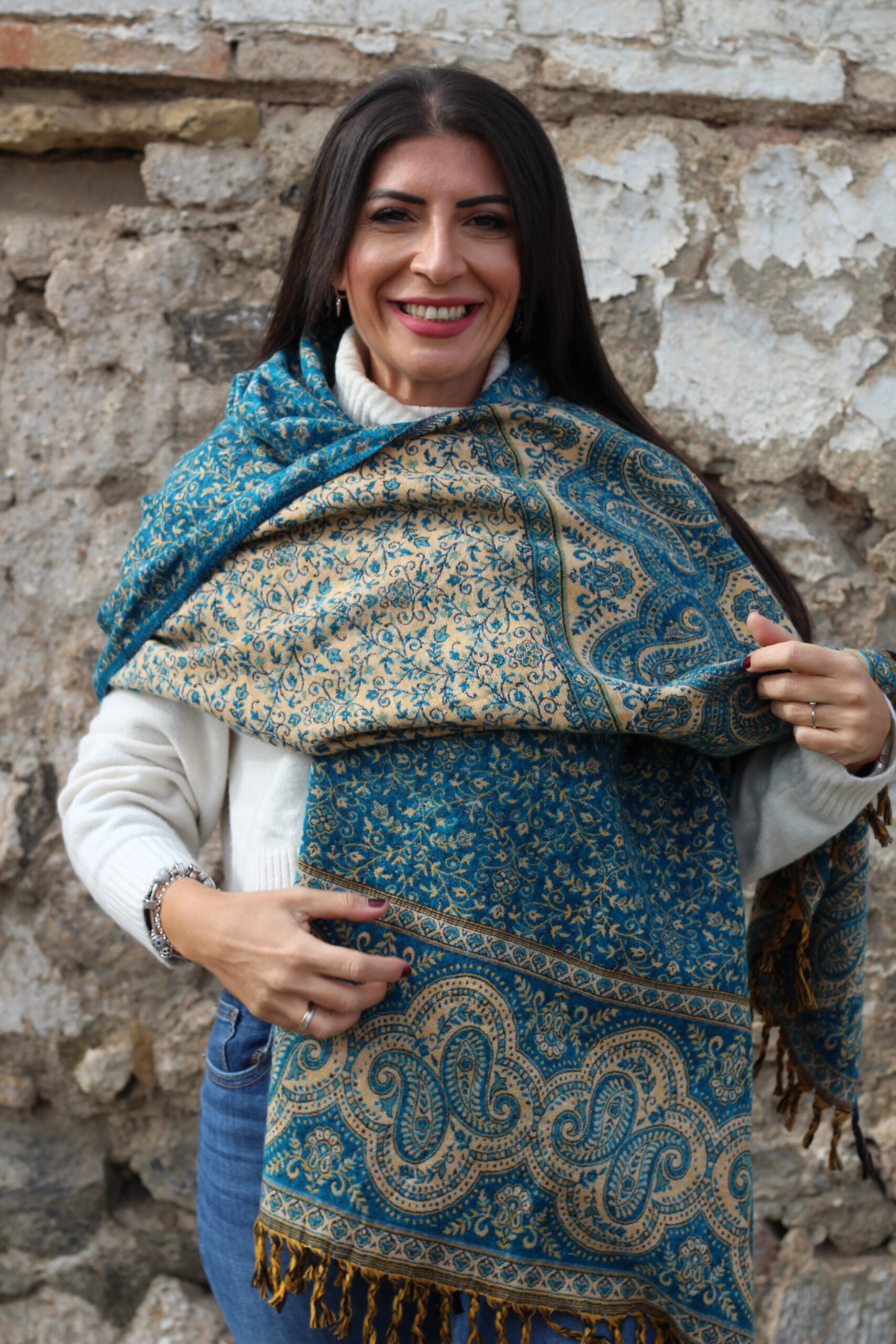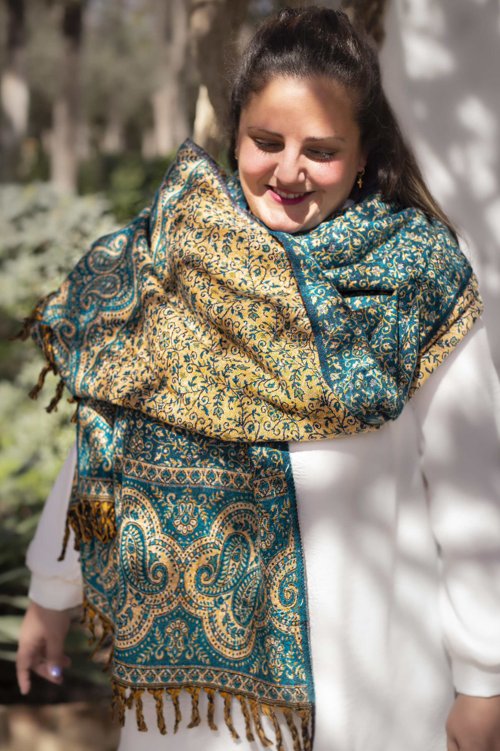 Este chal combina fibra de yak del Himalaya con algodón natural, creando un tejido suave, cálido, ligero y muy agradable al tacto. La mezcla aporta mayor durabilidad y estabilidad sin perder la calidez característica de la lana de yak.